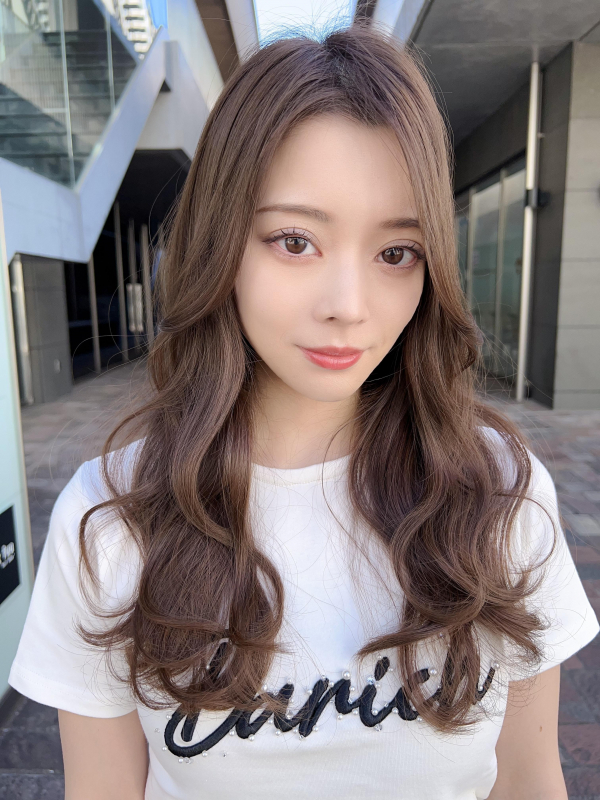 アッシュベージュ ミルクティーベージュ 波ウェーブ ロングヘアー 顔まわりカット